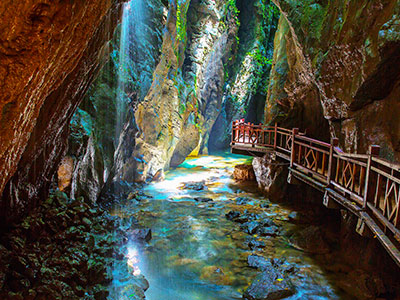 朝陽地縫一線天景區(qū)位于張家界慈利縣趙家埡水庫底部,是一個外河流入型的水底大溶洞,洞高30—80m,寬道5—25m,全長1550m,洞穴廊道呈峽谷狀態(tài),走向由南向北穿山而過,落差80余米,形成于高山峰叢喀斯特峽谷流域,深切河床滲漏石灰?guī)r斷層層里裂隙,向含水層集中循環(huán),再經(jīng)溶蝕、侵蝕崩塌作用,形成與原河道平行的地下通道,是喀斯特區(qū)過境河的伏流河。